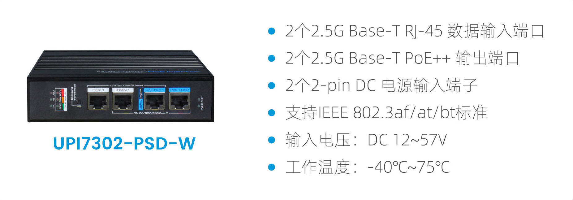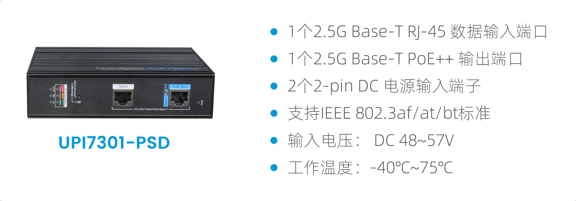 UPI7302-PSD-W和UPI7301-PSD-W均支持寬壓輸入(12V~57V直流電)??筛鶕?jù)實際需求選用不同規(guī)格的電源為設(shè)備進(jìn)行供電。